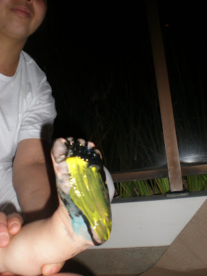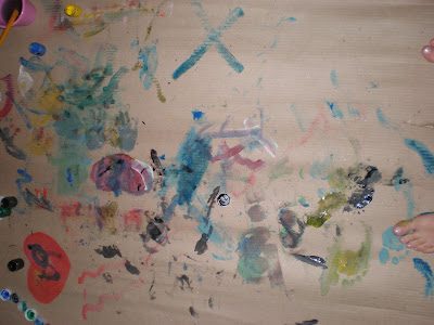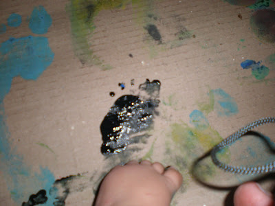 Caribamos nossos pés no papelão, até o pequeno entrou na dança, com a irmã pintando de guache o seu pezinho! E registrou sua marca no “papelão da fama!”