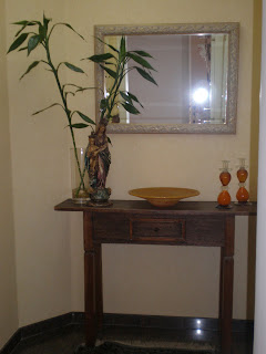 O hall de entrada, com o papel de parede amarelhinho, minha Nossa Senhora o aparador de demolição, os castiçais e agora a dracena, simbolizam o mesmo, na minha casa real. Há também escondidinho um aromatizador para que o olfato do visitante também seja sensibilizado.
