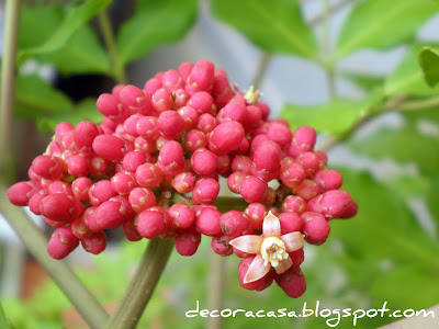 Olhando a planta com mais cuidado reparamos em uma bolinhas vermelhas no meio. Parece que ela já está pronta para o Natal! 😉