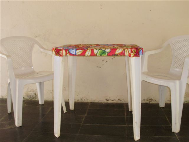 Primeiro email da Jael: “Oi Flávia, olha minha cadeira: veja o que era e o que ficou!!!! agora vou forrar a outra e pintar os pés, para completar o serviço. Com um metro de chita apenas, deu pra duas. A mesa eu quis fazer como se fosse uma “toalha” e não forrar tudo, acho que o efeito final ficou bem legal. Um abraço,