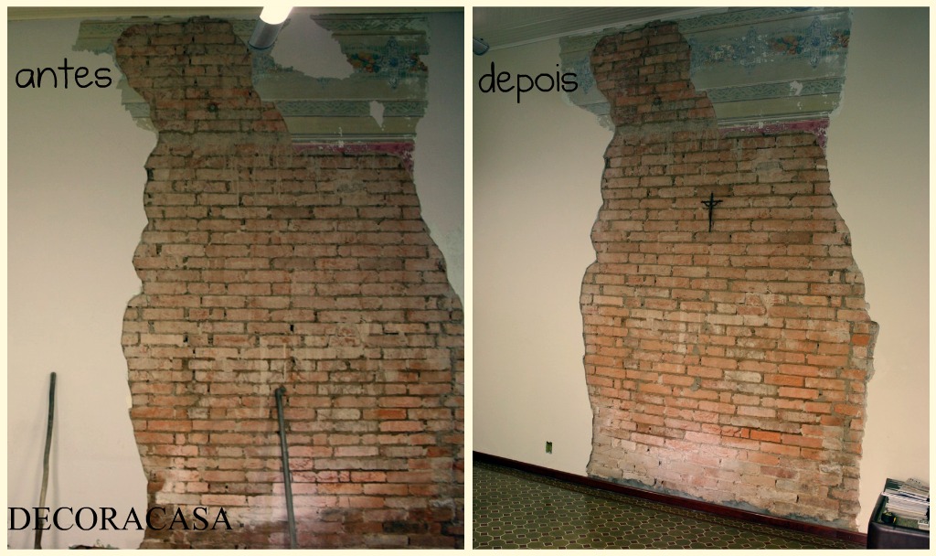 Meu pai comprou a idéia e deixou a grande parede com um misto de acabamento em tinta branca + tijolo aparente impermeabilizado com silicone + faixas do afresco.