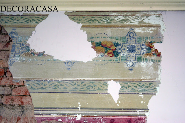 As paredes que foram descascadas para deixar os tijolinhos à vista revelaram um afresco pintado à mão.