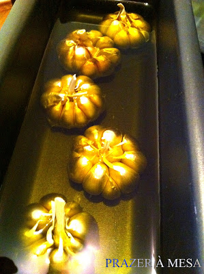 Em uma forma, coloque as cabeças de alho e despeje o conteúdo de um litro de azeite por cima ou até cobrir 2/3 das cabeças de alho.