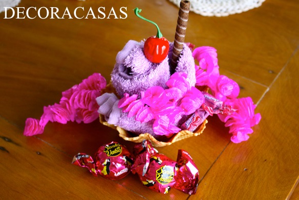Ontem, a revelação: toalhinhas fofas, enroladas em forma de sorvete na casquinha de verdade e com canudinho comestível. Para arrematar algumas balinhas e bombons (sim, em pouca quantidade, como toda mãe gosta).