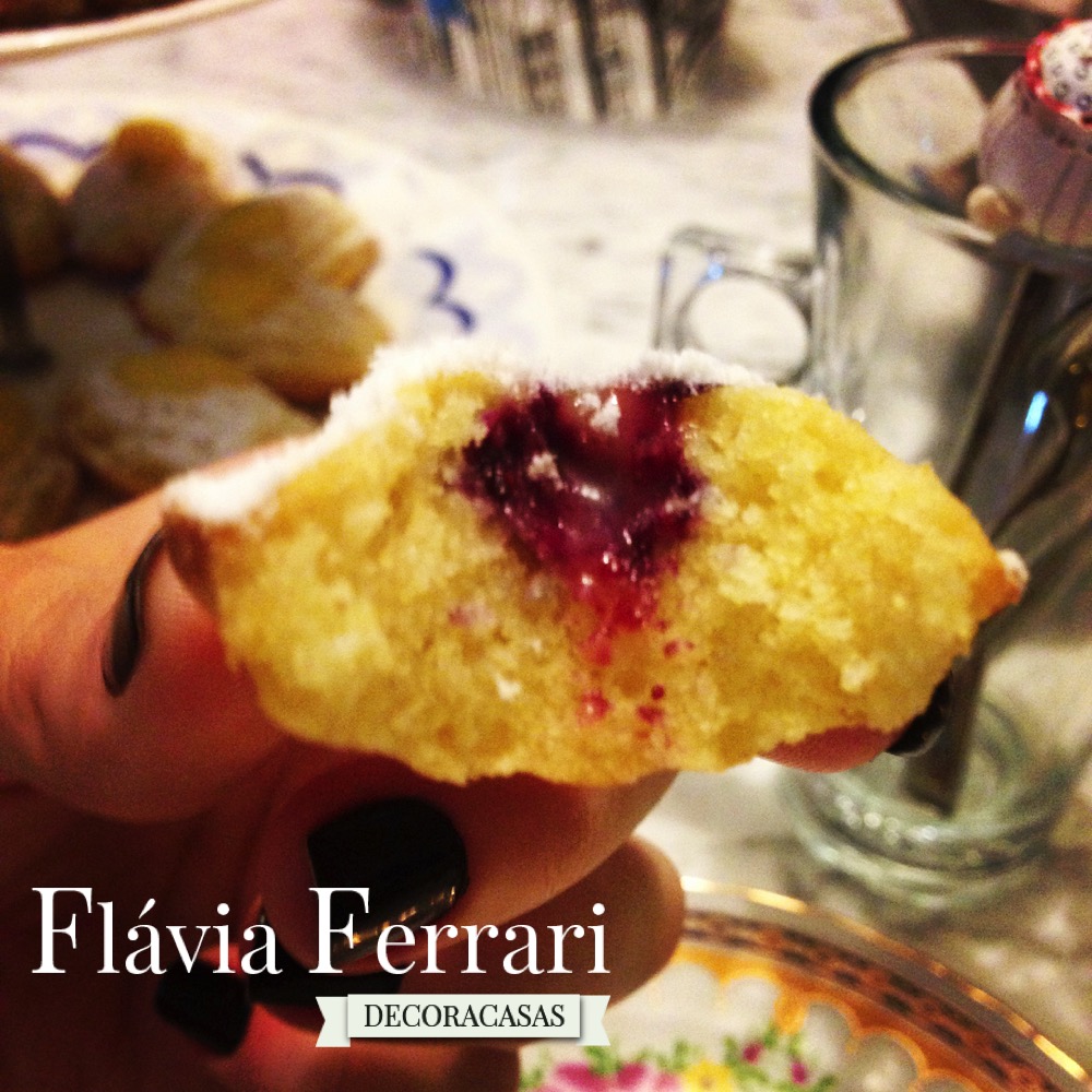Coloque uma boa colherada de massa em cada cavidade da forma e enfie uma framboesa na massa – eu substituí as framboesas por blueberry (mirtilos) o que também ficou delicioso!